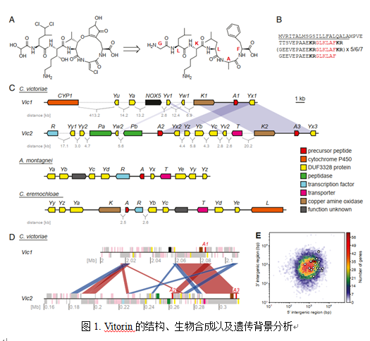 In the article, the author explained that victorin is a product of the Ribosomally synthesized and posttranslationally modified peptide (RiPP) family. Through the analysis of the new genome sequence after the assembly of long-sequence sequencing, it was found that the entire genome sequence of C. victoriae contains 3 copies of the precursor peptide synthesis gene (vicA1-3), and each copy contains the core peptide that constitutes the victorin peptide backbone ( GLKLAF) The number of repetitions is different. vicA1-3 is located in a highly repetitive and gene-sparse region of the genome, and forms a gene cluster with several genes that may be related to the formation of victorin. Knockout of one copy of vicA gene resulted in a great decrease in victorin production. Knock out the gene encoding DUF3328 protein (VicYb) in the gene cluster, and victorin cannot be produced at all, which also proves that DUF3328 protein is responsible for the oxidative cyclization of victorin. In addition, the author revealed that the knockout of copper amine oxidase (Copper amine oxidase) encoded by vicK resulted in a large accumulation of victorin precursor (HV-toxin), which indicates that the role of vicK converts HV-toxin into victorin.
