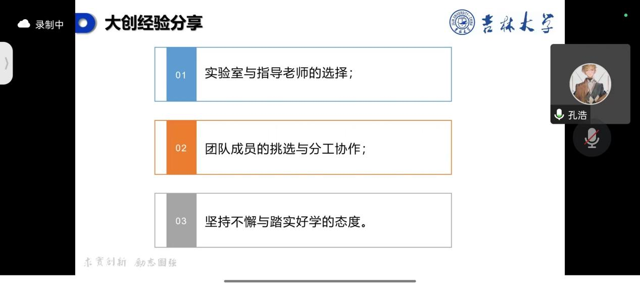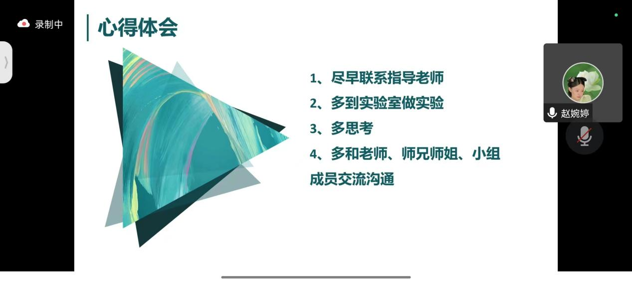 分享会上,2019级本科生王飞启、赵婉婷、孔浩等3位优秀员工代表作了分享报告。3位同学从自身实际出发,结合从事大创项目研究经历,围绕“大创的意义和作用”“大创申请的注意事项”“如何结合大创开展科研训练”“加强与指导教师的沟通交流”等多方面内容交流心得,从课题选择、实验过程、团队分工等方面分享宝贵经验。3位分享者对同学们提出的相关问题进行了耐心解答,鼓励同学们抓住机遇,踊跃参与,在竞赛中进步、在竞赛中成长。