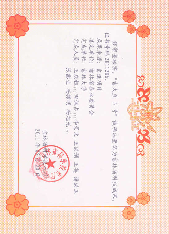 吉大豆3号,亚有限结荚习性,圆叶、白花、灰毛,株高90厘米。秆较强不倒伏,结荚密集。籽粒圆形,种皮黄色有光泽,种脐黄色,百粒重21克左右。籽粒粗蛋白质含量37.73%,粗脂肪含量20.41%。
