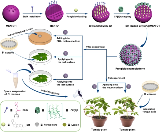 本成果为一种间超分子纳米药物递送平台用于灰霉菌防治,具体涉及灰霉菌,又称灰葡萄孢,是一种广寄主性的农作物病害。灰霉菌在空气中广泛分布,不仅能够侵染田间作物,同样会给植物的采后阶段造成巨大损失,日常生活中遇到的果蔬放一段时间会长毛,多数就可能是受到了灰霉菌的侵染。侵染初期,灰霉菌快速分泌草酸是灰霉菌的致病因子,草酸可以帮助灰霉菌破坏寄主防御系统目前,有研究利用生物防治菌抑制灰霉菌分泌草酸来抑制其侵染。鉴于灰霉菌在发病初期病斑周围pH的微环境(侵染初期分泌草酸),通过学科交叉设计出pH响应型杀菌剂控释纳米平台构,而且 pH敏感的纳米阀门响应系统已经利用小檗碱作为平台载药得到了验证,在灰霉菌侵染的开始阶段可以自动打开阀门实现靶向给药,具有良好的防治效果。