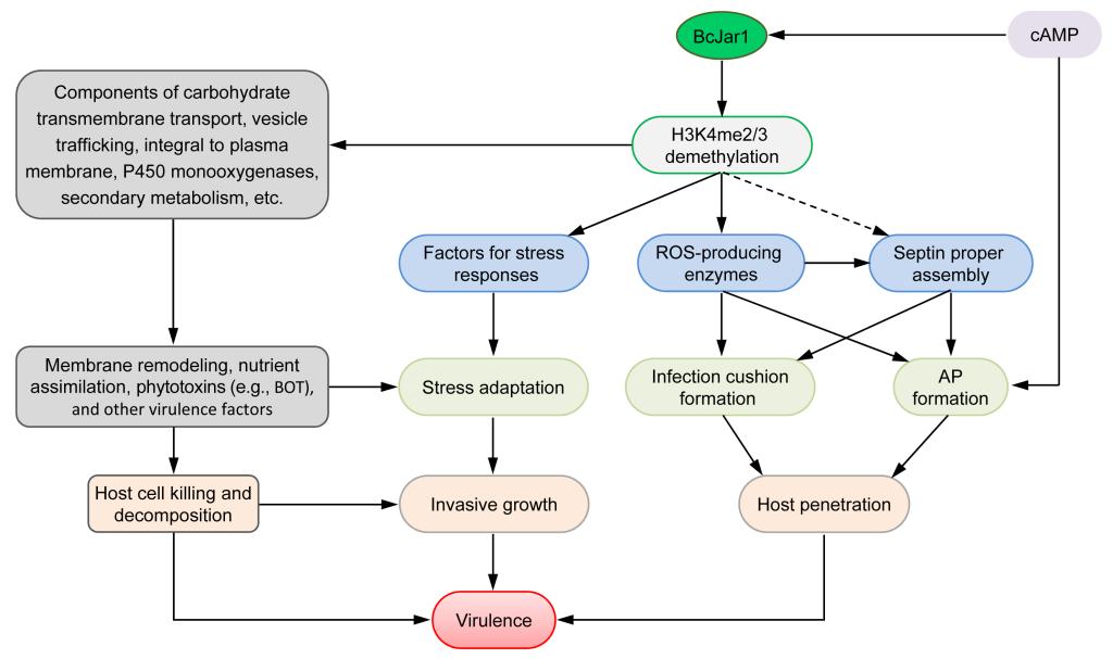 该研究发现,BcJar1调控灰霉病菌生殖生长及致病发育。BcJAR1缺失突变体分生孢子产量下降,孢子变小,仅产生少量附着胞但不能形成侵染垫及丧失致病性;伤口接种时,突变体可产生病斑但扩展较慢。进一步研究发现BcJar1通过调节H3K4me2/3甲基化水平控制侵染垫的形成;BcJar1通过调控内源ROS的产生进而调控灰霉病菌的生长发育,如孢子萌发、芽管伸长、侵染结构(附着胞和侵染垫)形成。外源环腺苷酸cAMP可部分恢复突变体附着胞形成能力,但无法恢复其侵染垫形成,表明cAMP可触发绕过因缺乏组蛋白去甲基化导致的附着胞形成缺陷的过程。BcJar1还直接或者间接介导隔膜蛋白Septin的富集和组装从而调控侵染结构的形成。转录组分析表明在侵染垫形成时期,BcJar1精细调控与ROS产生、胁迫应答、物质运输、致病相关、毒素合成、Septin调控、细胞壁降解、营养物质同化等相关基因的表达,这些基因的差异表达与病原菌侵染相关发育、胁迫适应及致病等表型相符。该研究为组蛋白去甲基化修饰调控灰霉病菌致病性提供了新见解。