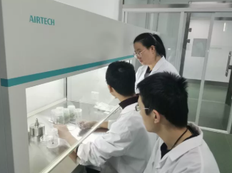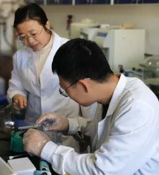 ▲李绪彦副教授与员工分析研究结果(左图) 王晶莹老师指导员工做实验(右图)