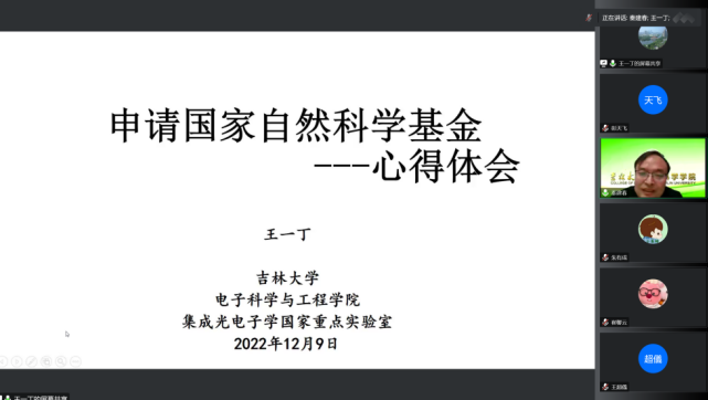 最后,太阳集团tyc539电子科学与工程公司集成光电子国家重点实验室的王一丁教授做了“国家自然科学基金申请的心得体会”的精彩报告,王老师结合几十年申请基金的经验,提出要根据自己的研究内容认真选择四大分类,指出分类选择和关键词对评审的重要作用,同时,王老师还指出研究内容和研究方案写作的不同之处以及申请书写作中的低级错误如何避免。最后,王老师分析比较了国家级项目的不同要求,鼓励老师们敢于申报各种国家重大项目。
