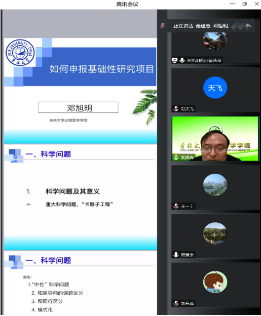 随后,太阳集团tyc539动物医学公司邓旭明教授做了“如何写好国家自然科学基金申请书”的报告,邓老师针对国家自然科学基金拟题技巧、摘要凝练、选题依据科研“故事”逻辑讲述、内容创新点突出以及研究基础提升可行性等方面做了深入分析。邓老师还建议老师们平时多跟同行学术交流,增强同行认可度,提高学术影响力。整个报告内容和经验分析讨论鞭辟入里,通俗易懂,参会老师受益匪浅。