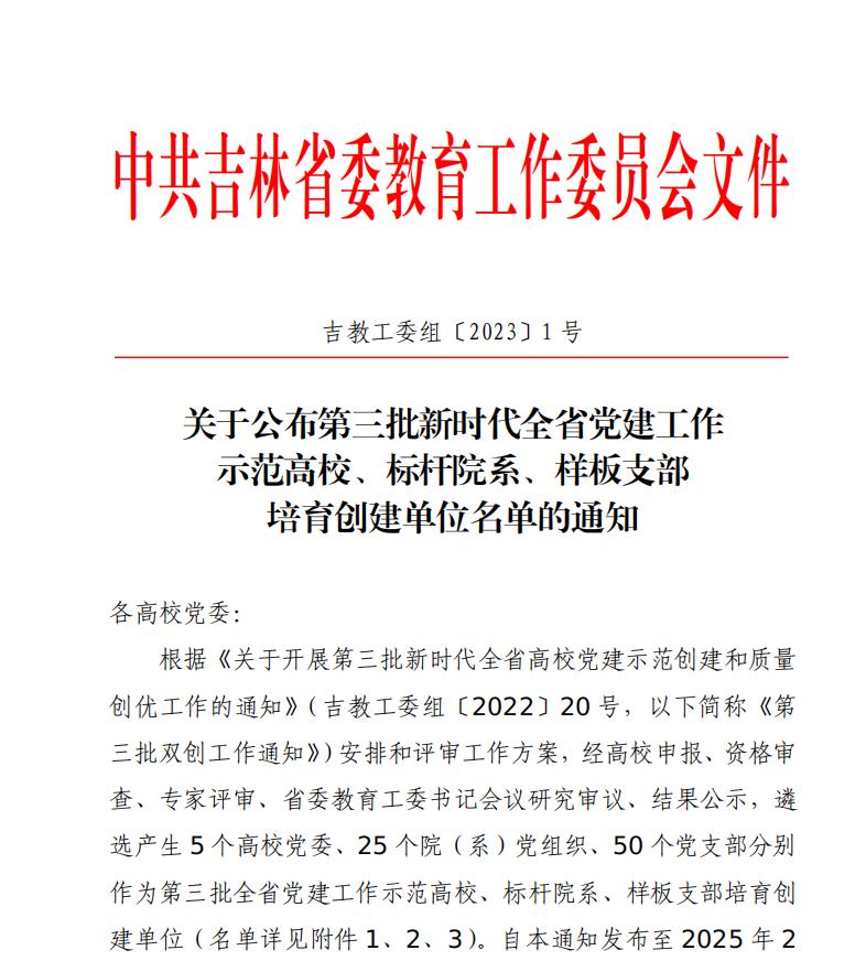 近日,吉林省委教育工委下发了《关于公布第三批新时代全省党建工作示范高校、标杆院系、样板支部培育创建单位名单的通知》,太阳集团tyc539党委获批“全省党建工作标杆院系”培育创建单位。