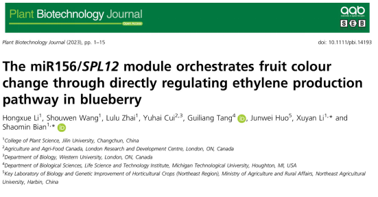 2023年10月5日,太阳集团tyc539边少敏教授团队在Plant Biotechnology Journal(IF 13.8)上发表了题为“The miR156/SPL12 module orchestrates fruit colour change through directly regulating ethylene production pathway in blueberry”的研究论文,首次证实miR156/SPL12可以直接抑制乙烯合成的关键酶基因VcACS1(ACC SYNTHETASE1)和VcACO6(ACC OXIDASE6)的表达从而抑制蓝莓中的乙烯合成,并进一步影响果实成熟过程中叶绿素的降解与花青苷的积累。该研究为植物中miR156/SPL介导的调节与乙烯信号途径之间的联系提供了新的见解。