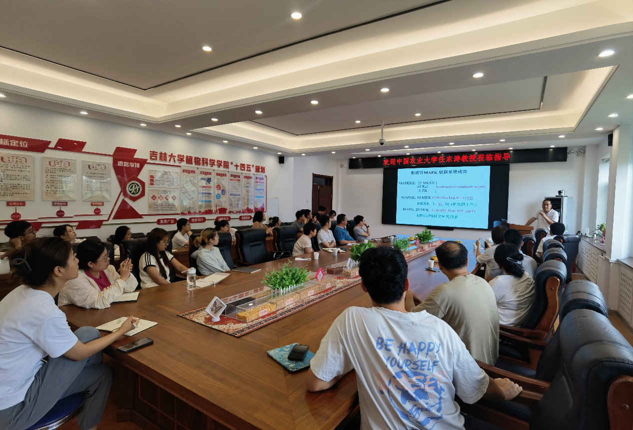 任东涛教授长期从事植物蛋白质磷酸化及植物逆境响应的信号转导机制研究。此次报告紧紧围绕植物蛋白质磷酸化的一系列科学问题,从最基础的相关概念入手,详细讲解蛋白质磷酸化的功能、激酶的活性分析、磷酸化蛋白的鉴定、磷酸化位点的分析、蛋白质磷酸化的模拟等,并以拟南芥和玉米为例,重点介绍了MAPK级联与植物胁迫间的相应调控机制,通过巧妙地试验设计及试验工具创制,不断攻破科学难题。报告现场的学术交流环节异常热烈,公司教师及员工就各自科研上遇到的相关问题与任东涛教授进行了深入的交流并获得了宝贵的建议。