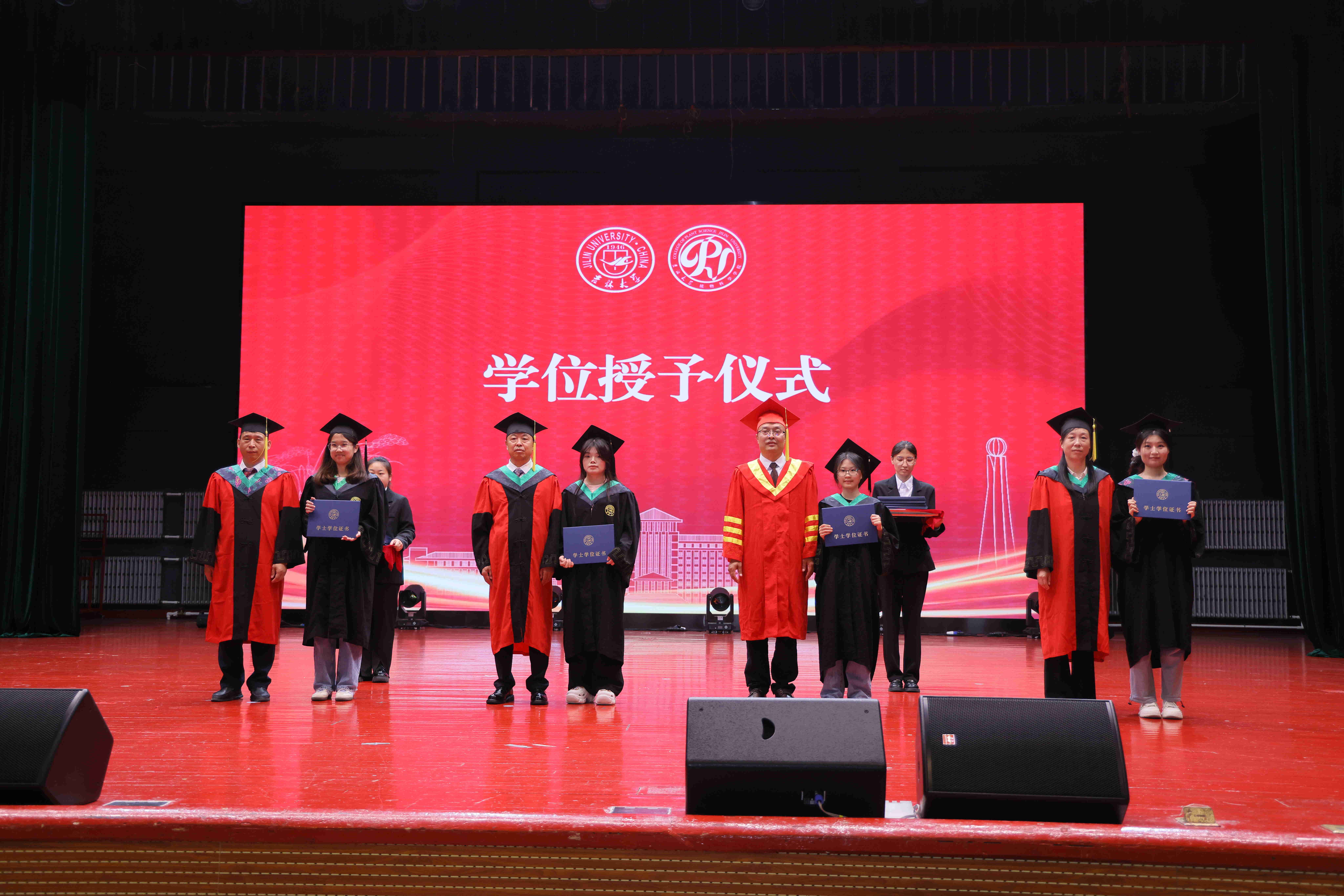 主礼教授秦建春、都兴林、边少敏、曹宁为毕业生授予学位、拨动流苏并合影。在庄重而喜悦的氛围中,2025届全体毕业生身着学位服,依次走上主席台。