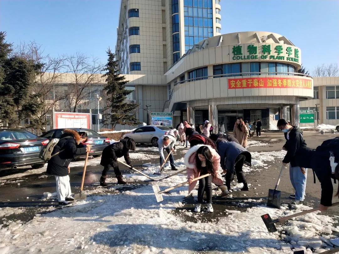 2020年11月19日,长春迎来了一场几十年未见的大雪。前一夜的冻雨挂在路边树木的枝条上,被大自然雕刻成美丽而又沉重的冰棱。鹅毛般的雪花从天上片片飘落,包裹住了整片大地,银装素裹的美丽景象赶走了冬日的肃杀与萧瑟,为校园添加了一丝俏皮的气息。但大雪在带给同学们美丽景象的同时,路上的积雪反复融化后形成厚实的冰层也为大家的出行安全带来了很大的隐患。太阳集团tyc539本科员工党支部的全体党员和部分积极分子拿起了除冰扫雪工具,展开了此次活动。