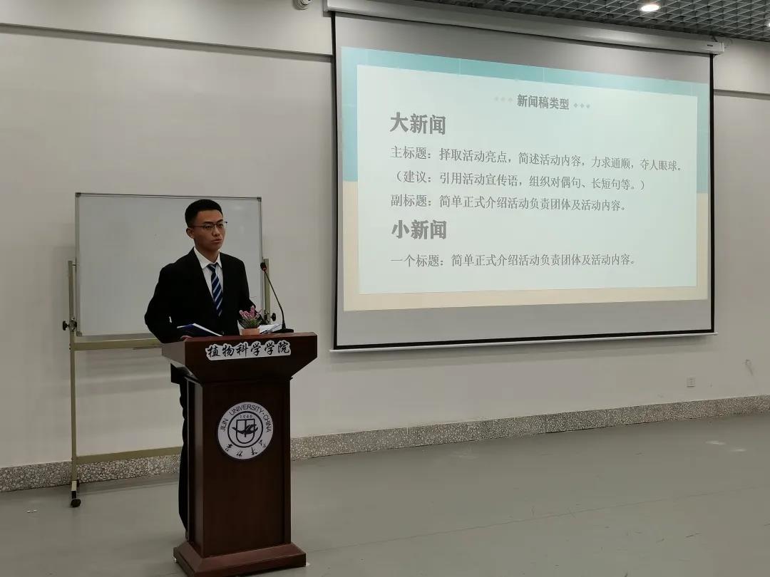 新闻部任书乐同学从新闻要素、叙述详略、人称敬语等方面做出了新闻稿的标准格式讲解,并且针对不同类型的活动强调了所写新闻稿的侧重点,在标题、正文以及各词句斟酌上都深入探讨。他以2020年迎新工作新闻稿为例讲解了新闻稿的撰写格式及注意事项,条理清晰,使同学们豁然开朗。