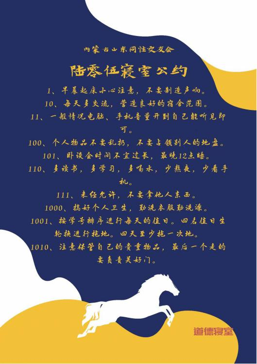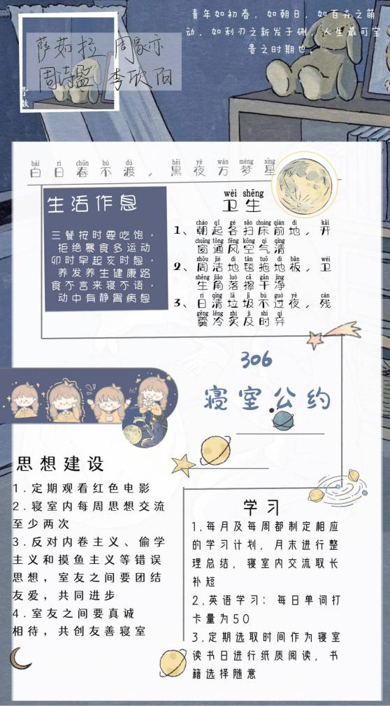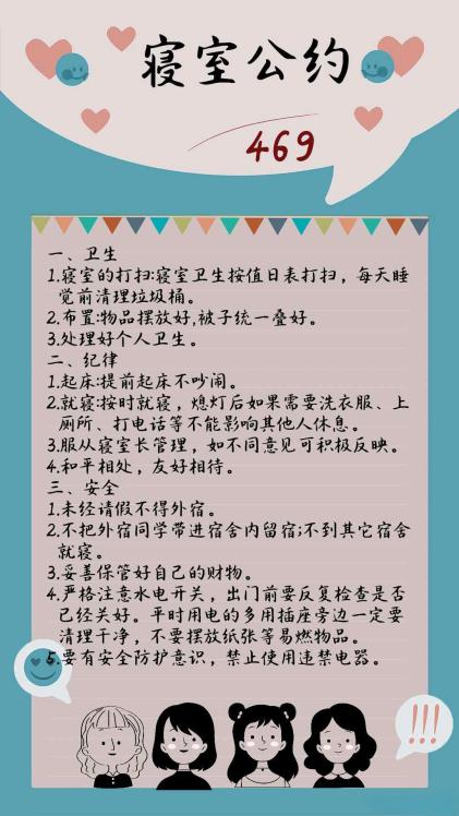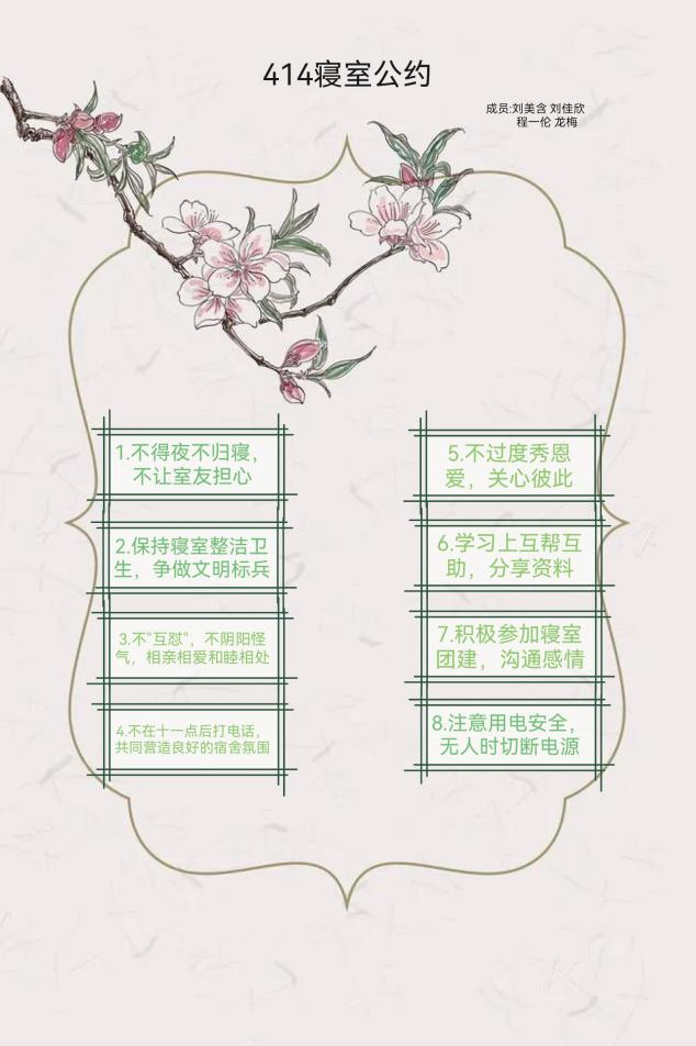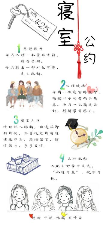 寝室文明不仅体现在物质装饰上,更体现于团结一致的寝室精神,寝室公约作为一个寝室共同遵守的准则,是寝室文化精神的最好诠释。希望各位同学能够以优秀寝室为榜样,积极发展寝室建设,营造寝室良好氛围,让寝室成为我们共同的家!