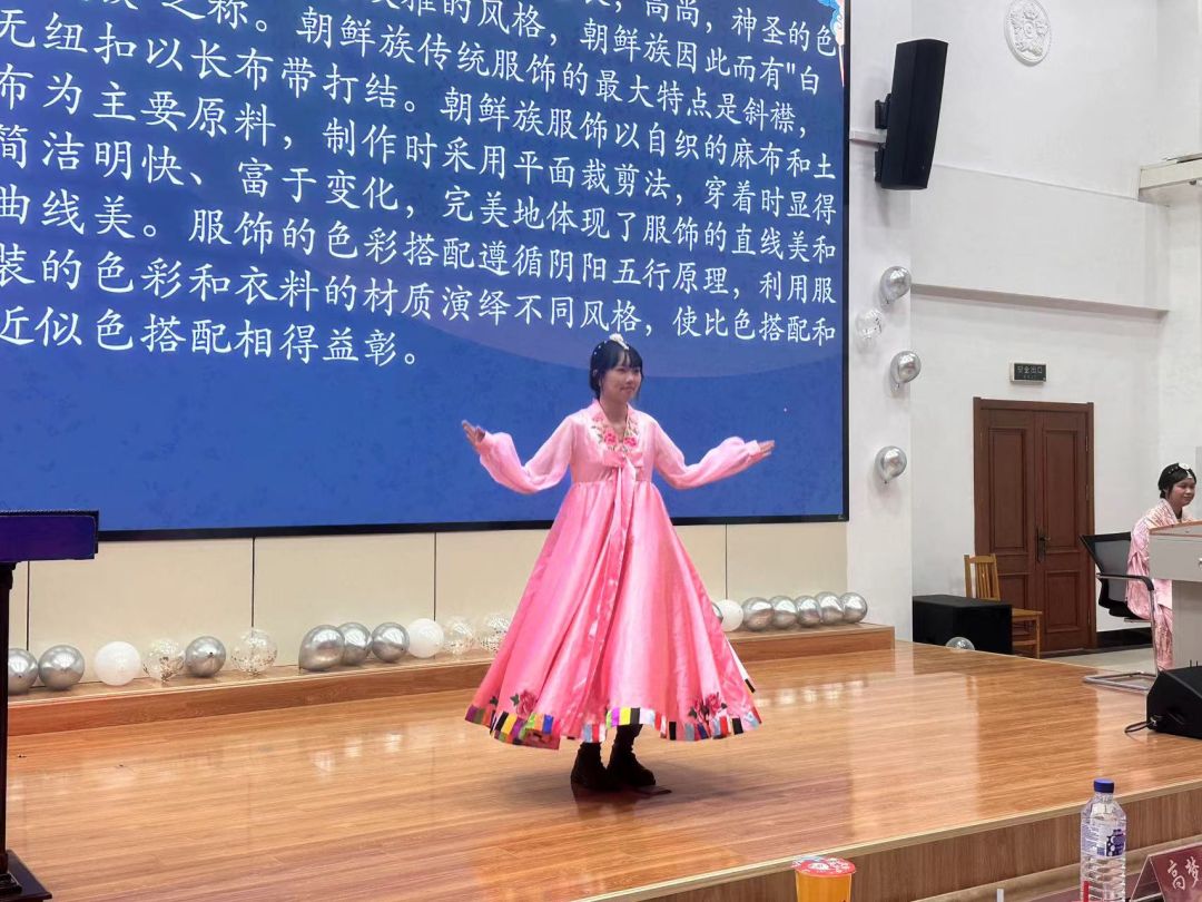 活动在哈萨克民族独舞《黑走马》中正式拉开序幕,阿依波塔踩着节拍婆娑起舞。悠悠冉冉的歌曲,配上流畅自然的舞蹈,为观众带来了一场视听盛宴。紧接着就是妙趣横生的少数民族语言教学,同学们在学习到苗族和彝族语言的同时,感受到中华语言文字的博大精深,也对中华民族不同文化交流互鉴优秀成果有了新的认识。